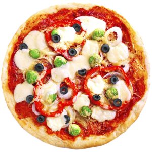 Extra-virgin olive oil, garlic, mozzarella cheese, onions, mushrooms, green olives, black olives, fresh tomatoes.